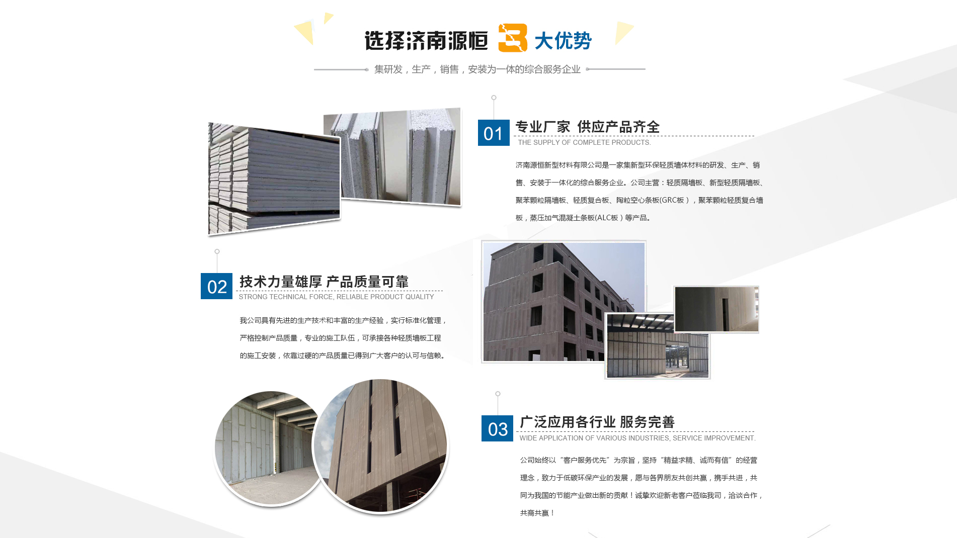 濟南源恒新型材料有限公司坐落于美麗的泉城濟南,是集新型環(huán)保輕質(zhì)墻體材料的研發(fā)、生產(chǎn)、銷售、安裝于一體化的綜合服務(wù)企業(yè)。我公司具有的生產(chǎn)技術(shù)和豐富的生產(chǎn)經(jīng)驗,為您提供輕質(zhì)隔墻板、新型輕質(zhì)隔墻板、聚苯顆粒隔墻板、輕質(zhì)復(fù)合板、陶??招臈l板(GRC板),聚苯顆粒輕質(zhì)復(fù)合墻板,蒸壓加氣混凝土條板(ALC板)等產(chǎn)品,本公司有專的施工隊伍,可承接各種輕質(zhì)墻板工程的施工安裝。輕質(zhì)隔墻板是國家推廣使用的新型輕質(zhì)、綠色無害建材,是墻改節(jié)能政策大力扶持的環(huán)保節(jié)能產(chǎn)品,是發(fā)達(dá)國家普遍采用的新型墻體材料。濟南源恒新型材料有限公司實行標(biāo)準(zhǔn)化管理,嚴(yán)格控制產(chǎn)品質(zhì)量,依靠過硬的產(chǎn)品質(zhì)量已得到廣大客戶的認(rèn)可與信賴。公司產(chǎn)品遍布各大城市,與國內(nèi)多家客戶建立了良好的合作關(guān)系。公司始終以“客戶服務(wù)優(yōu)先”為宗旨,堅持“精益求精、誠而有信”的經(jīng)營理念,致力于低碳環(huán)保產(chǎn)業(yè)的發(fā)展,愿與各界朋友共創(chuàng)共贏,攜手共進(jìn),共同為我國的節(jié)能產(chǎn)業(yè)做出新的...